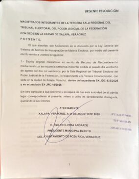 Xalapa, Ver. – Con carácter de urgente, el presidente municipal electo de Poza Rica, Emilio Olvera Andrade, presentó este día un Recurso de Reconsideración ante la Sala Superior del Tribunal Electoral del Poder Judicial de la Federación (TEPJF), con el cual impugna la sentencia incidental emitida el pasado 28 de agosto de 2025 por la Sala Regional Xalapa, dentro del expediente SX-JDC-633/2025 y su acumulado SX-JRC-16/2025.