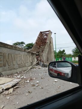 Tremendo susto se llevaron automovilistas luego de que se desplomara el arco de bienvenida, que se encuentra en la entrada de este municipio, pues estuvo a punto de caerle a una unidad de alquiler.