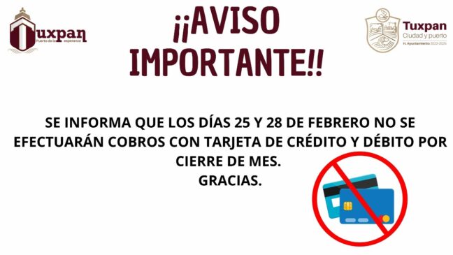 Se informa a los contribuyentes que, por ser cierre de mes, los días 25 y 28 de febrero no se aceptarán pagos con tarjeta de crédito y débito.