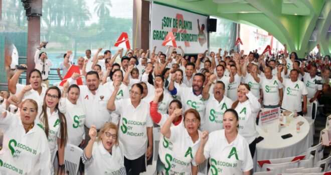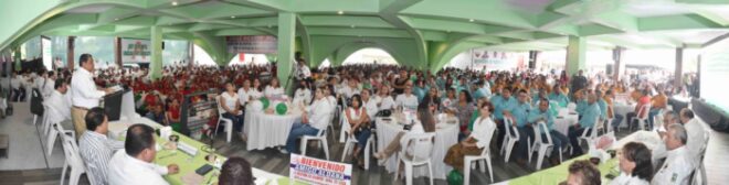 En el recinto Luis Ricardo Aldana Prieto, refrendó el llamado a mantenerse en unidad, con la finalidad de reforzar la defensa de su contrato colectivo de trabajo, que hasta la fecha va ganando terreno y quedó demostrado, dijo, con la entrega simbólica de los apoyos del programa “Becas Compromiso 30”, a hijos de trabajadores.