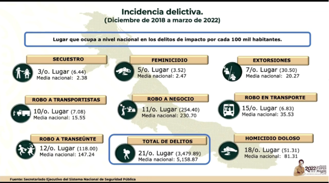 La mañana del viernes 22 de abril el titular de la SEMAR explicó la incidencia delictiva en el estado de Veracruz, el cual ocupa el tercer lugar nacional en secuestros, el quinto lugar en feminicidio y el séptimo lugar en extorsiones.